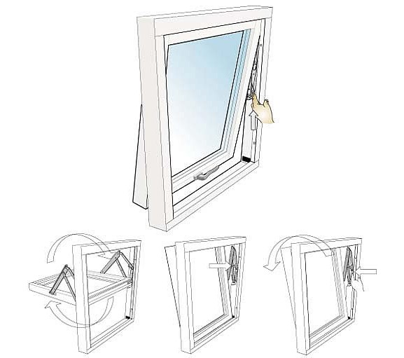 Schwingfenster Trarydfenster - U = 1,0. Aussen: Hinterlüftete Aluminiumbekleidung, sehr pflegeleicht und langlebig.