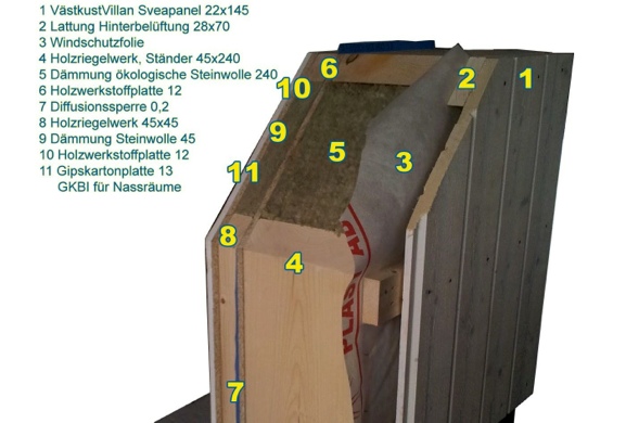 01.01.2013 Schwedenhaus Effizienzhaus - Aussenwand, mit 240 mm Steinwolle zwischen den Holzständern + 45 mm Steinwolle in der Installationsebene. U-Wert ca. 0,15 | top Wand, top Wert.