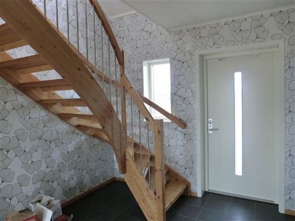 Original schwedische Geschosstreppe von ATAB AB, SkandiHaus standard Treppe Kiefer, Eiche gebeizt, Geländer Stahl, Handlauf Kiefer.